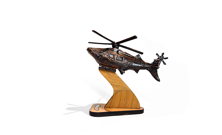 Like battlefield improvisation, these hybrid beings transform human waste into instruments of resistance and survival. Sculptures made of the very debris animals might scavenge in a post-collapse world. Using mixed media including acrylic putty, acrylic paint, metal and found objects.